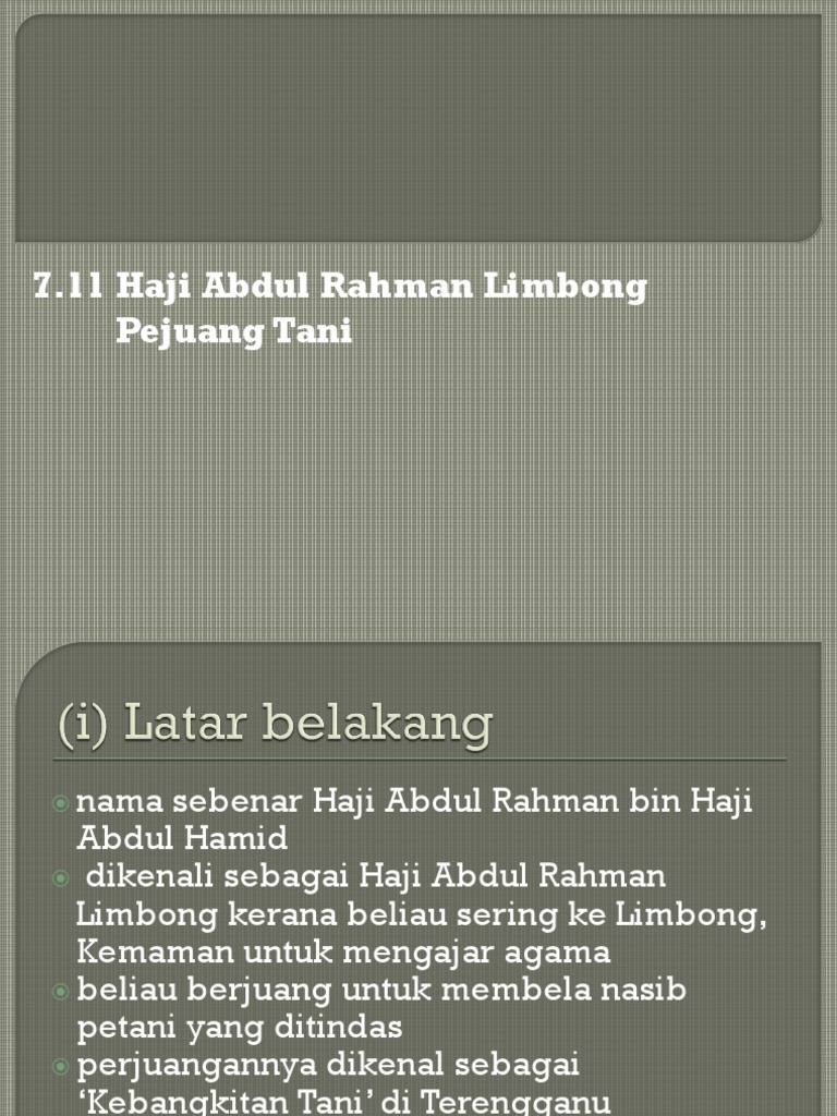Beliau merupakan seorang yang peramah, berperibadi baik,mempunyai latar belakang pendidikan yang cemerlang, amalah sangat pemurah dengan masayarakat setempat. Pengetahuan agamanya yang mendalam adalah satu keistimewaan. B) pada tahun 1992, haji abdul rahman limbong bertindak sebagai peguam untuk membela peeteani di kuala telemong yang ditangkap kerana pihak british telah melancarkan serangan dan haji abdul rahman limbong telah ditangkap. Haji abdul rahman limbong was a religious scholar and a malay fighter feared by the british colonialists. Latar belakang dan tujuan konferensi meja bundar. Beliau dijatuhi hukuman buang negeri ke mekah. Kenapa perjuangan islam sukar untuk menang tg haji abdul hadi. Nama lengkapnya ialah haji abdul rahman bin haji abdul hamid bin haji abdul qadir. 1922'de haji abdul rahman limbong, izinsiz çiftçilik yaptığı için mahkemede yargılanan 43 çiftçiden birini temsil etti. Keperibadian haji abdul rahman limbong dikenali dan disayangi ramai dengan personaliti yang begitu menyenangkan. Beliau yang dianggap alim lagi keramat ini sangat dihormati. Latar belakang sejarah kesultanan palembang darussalam. Di antara gurunya ialah haji tun muhammad, salah seorang ayah saudaranya.