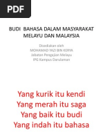 Bahasa malaysia satu anugerah yang perlu dipertahan dan dihayati setiap warga bangsa malaysia. 'yang merah itu saga, yang kurik itu kendi, yang indah itu bahasa, yang elok itu budi', demikianlah ungkapan yang menggambarkan kepentingan berbudi bahasa dan amalan nilai murni dalam kehidupan masyarakat kita. Sesungguhnya kutukan kedua orang tua itu memutuskan asal anak itu jika anak itu. 3)ada ubi ada batas,ada budi ada balas kebaikan yang dilakukan akan dibalas dengan kebaikan. 4)ada udang di sebalik batu ada sesuatu yang dikehendaki di sebalik perbuatan yang dilakukan.
