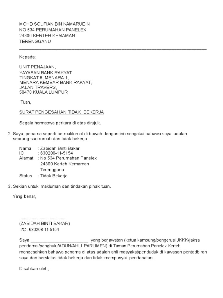 Surat Pengesahan Tidak Bekerja - Surat pengesahan tidak bekerjafull description.. ( keterangan masih hidup dan daftar keluarga dll ). Pengesahan majikan bermaksud pengesahan terhadap seseorang pekerja yang bekerja di sesebuah syarikat yang antara lain memaparkan surat pengesahan majikan diperlukan oleh sekolah untuk mereka yang tidak mempunyai penyata gaji atau ingin membuat pinjaman kepada bank atau institusi. Surat pengesahan tanda bukti diri. Savesave surat pengesahan tidak bekerja for later. Surat akuan pengesahan pendapatan ini adalah sebagai pengesahan pendapatan pemohon daripada daripada orang tertentu.